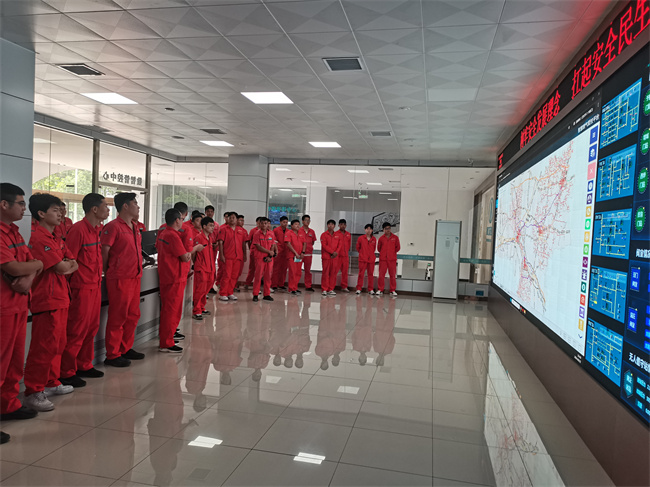 在一樓數(shù)智管控中心觀摩學習現(xiàn)場,數(shù)智管控中心主任劉軍祥詳細講解了點火、安檢、巡檢、施工監(jiān)護、設備設施維保等智慧燃氣應用狀況以及通過后臺對前端工作質量的抽查監(jiān)管職能。